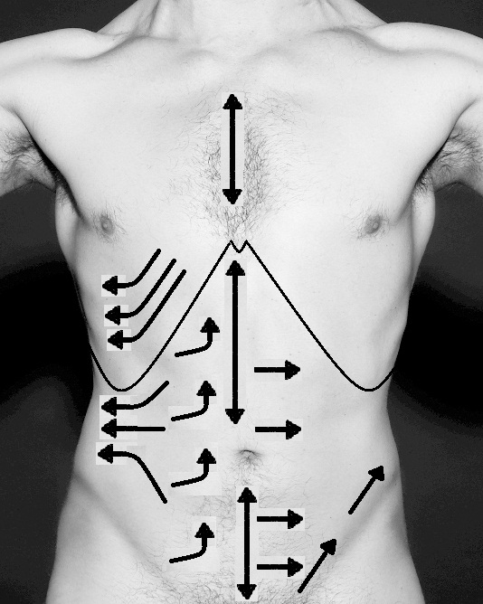 Realizamos una nueva palpación específica para valorar el contenedor en función del contenido desde el estómago hasta el recto. Comprobamos cada órgano de forma asociada al tubo digestivo evaluando si su relación con el peritoneo está o no afectada al igual que su sensibilidad en caso de tener libre acceso al mismo. Valoramos también la posición con respecto a las referencias óseas cercanas dentro de las nueve regiones anatómicas del abdomen.